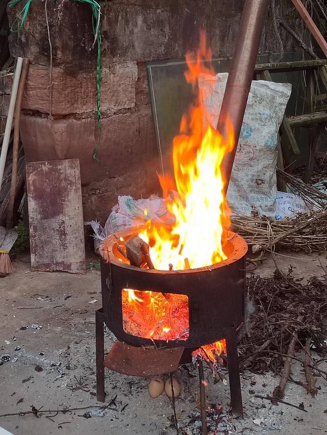 亲家所在遂宁的桂花小镇,南面靠涪江,东、北、西三面靠山。我与亲家父母久别后重逢,当然有说不尽的话,但是亲家要赶去赴别人家的生日宴,我和亲家母等人简单吃了午饭后,大家开始筹备晚上的年夜饭。为了驱赶冬季的严寒,也在后院点上了柴火炉烧起来。炉下灰烬中埋了两个取了蛋清后的鸡蛋,准备闷熟。