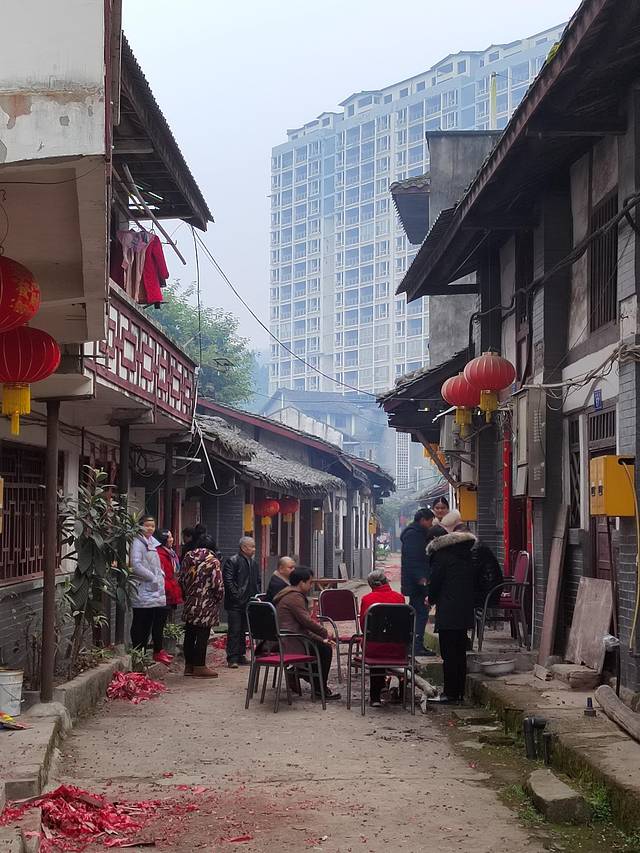 小巷的住户们也在巷子里围着烤火,远处楼房据说是私人贷款两千万建起的,但是生意不好做,据说现在银行利息都还不上。