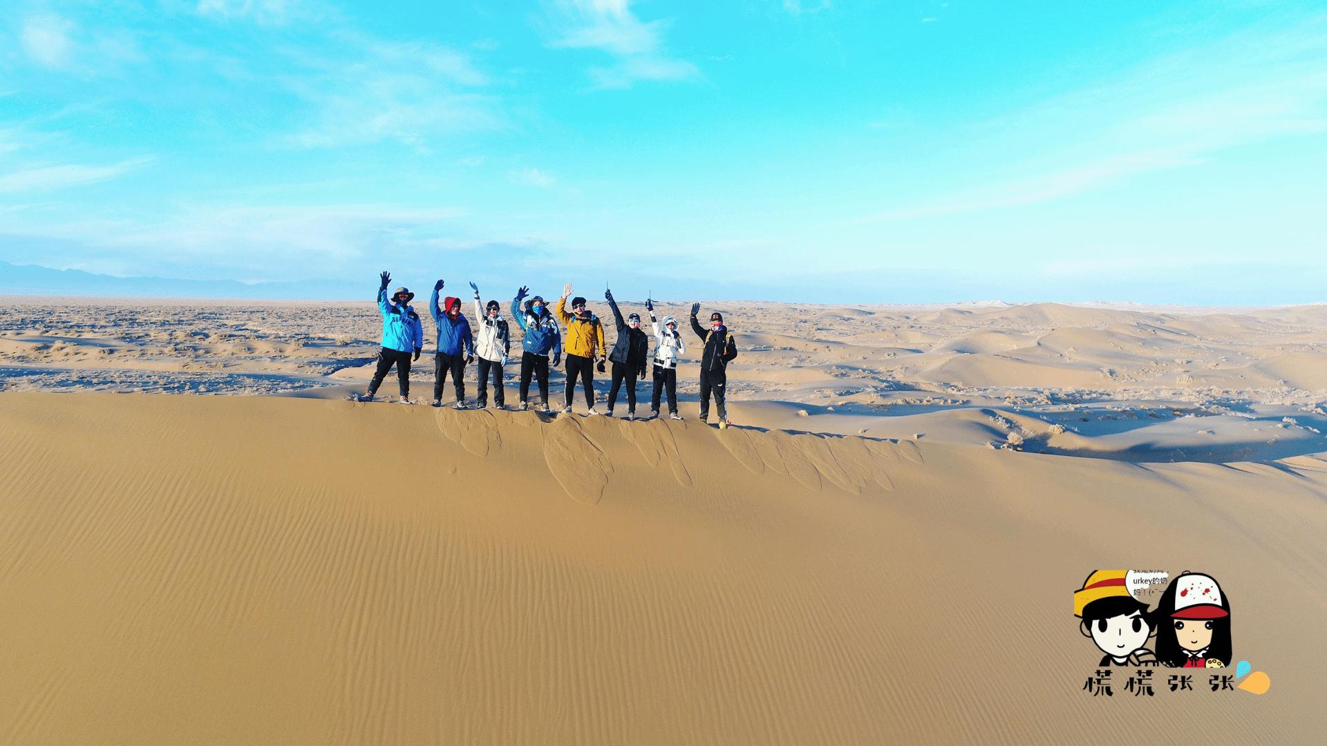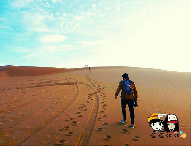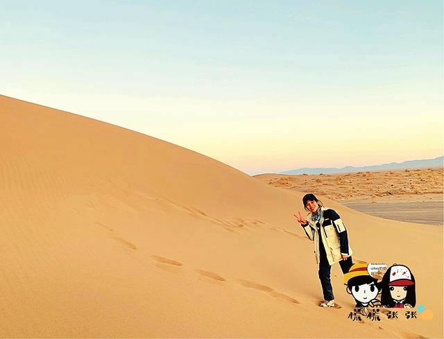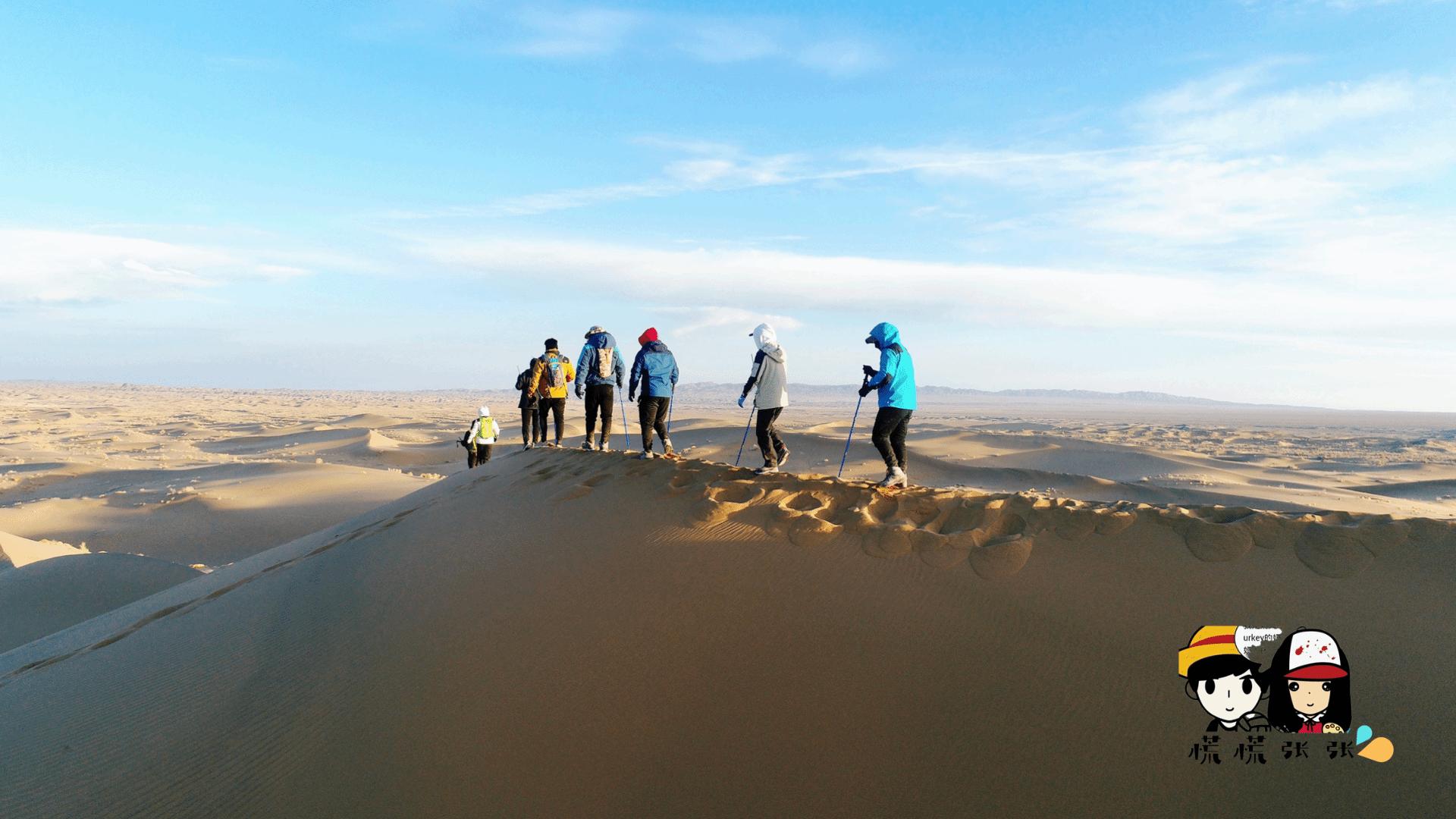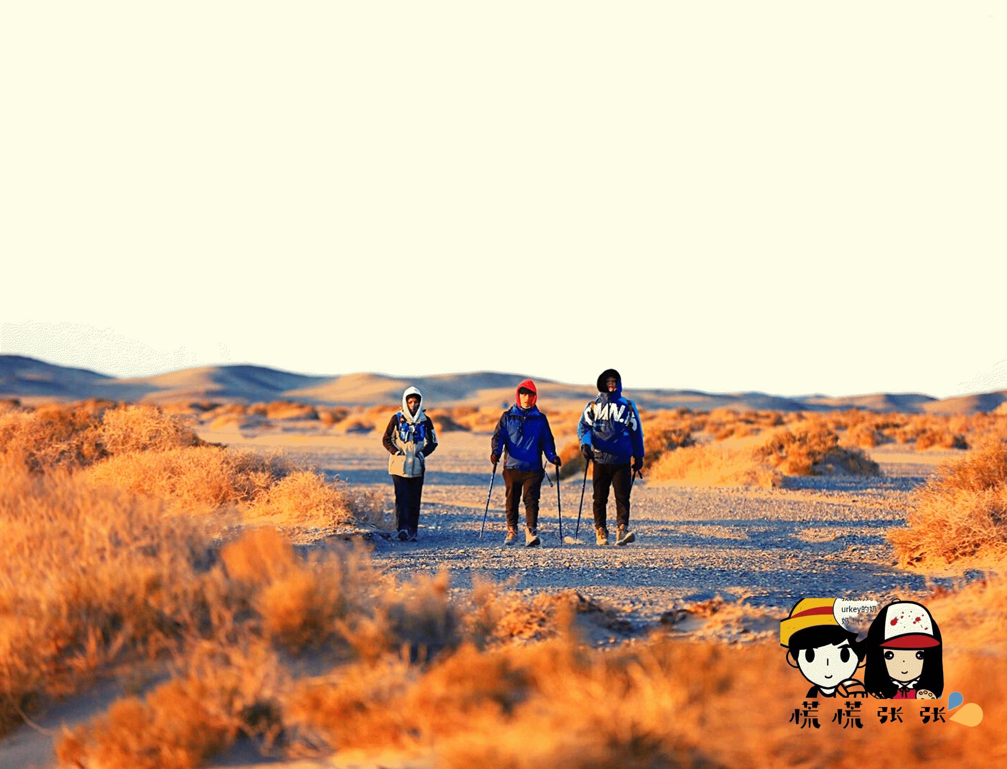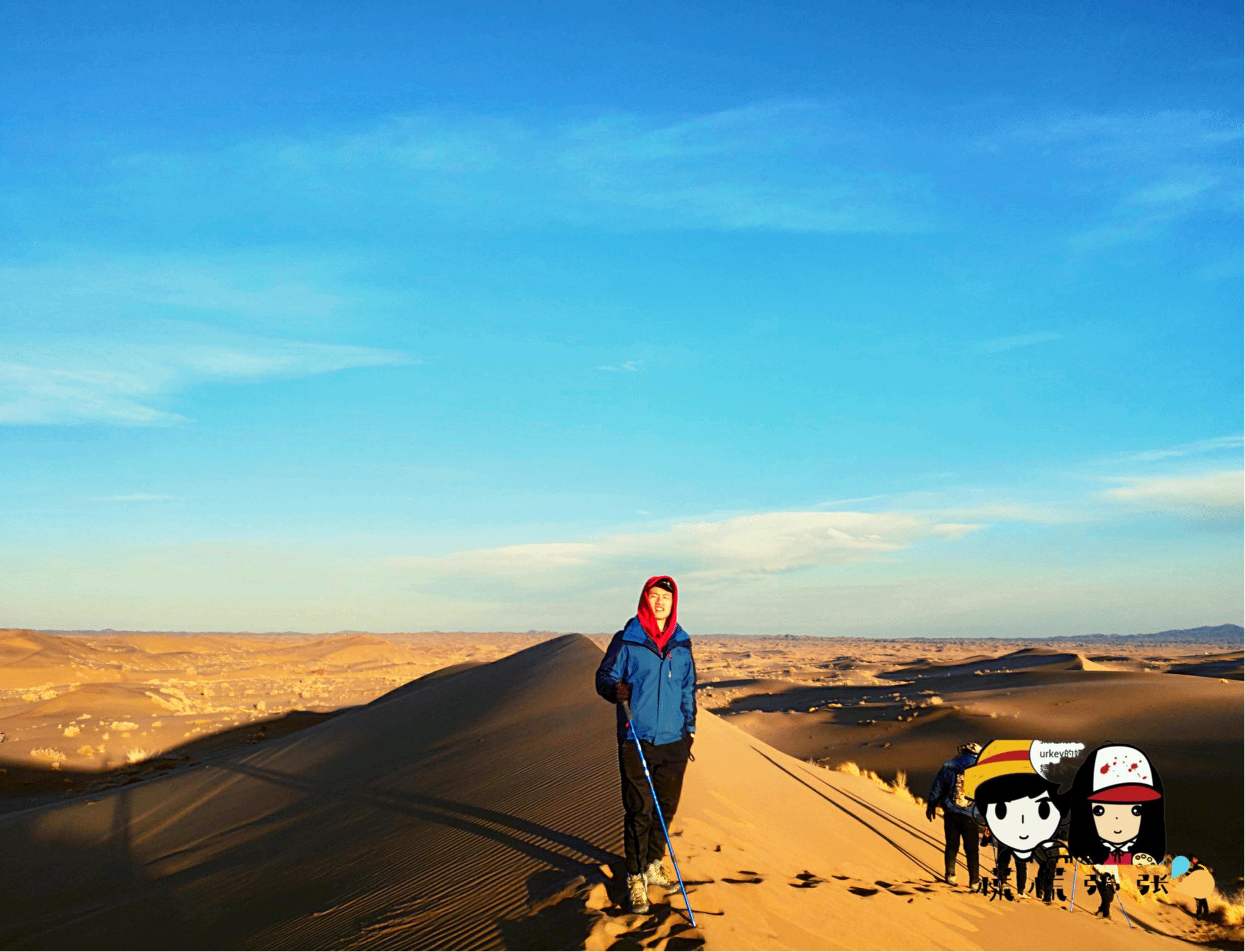 (早早起来,爬到最高的沙丘看日出,绝美!!!然后走一段时间的沙漠,再走回戈壁滩。这一天是比较考验人的,路程分配最长。我们最后几个人边走边玩到天黑才到营地😅)
