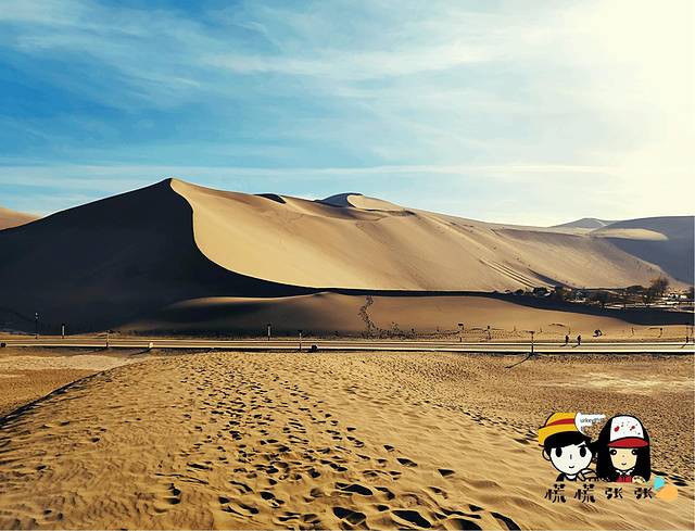 经过鸣沙山⛰️石碑,翻上一座小沙丘,就会看到前面这条🛣公路,接着往前走很快就可以看到月牙泉