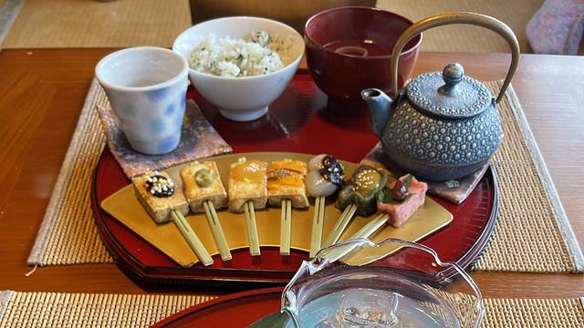 在犬山城下町的中间有一家叫做“本町茶寮”的田乐料理店,田乐是在豆腐上涂上味增的传统料理,在这里可以享受到现代风味的各种味道。这家店的“金鱼”是人气菜单,让悦奈大呼过瘾!以金鱼为主题、五颜六色的配色非常上品又看起来美味,金鱼缸形状的饮品特别有趣,里面有很多红色金鱼的果冻小糖、感觉真实的金鱼缸一样,特别有创意。套餐是田乐的各种口味、每口吃下去都有小惊喜、都是完全不一样的味道。