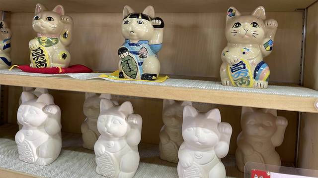陶器街上布满形态各异的陶器,其中有个巨大的常滑招财猫“tokonyan”,最为引人注目。它在一个人行天桥的旁边,不能接近拍照,招财猫前面还有两只通常大小的猫咪的雕塑,逼真得可以以假乱真,这样的设计巧思非常可爱。
