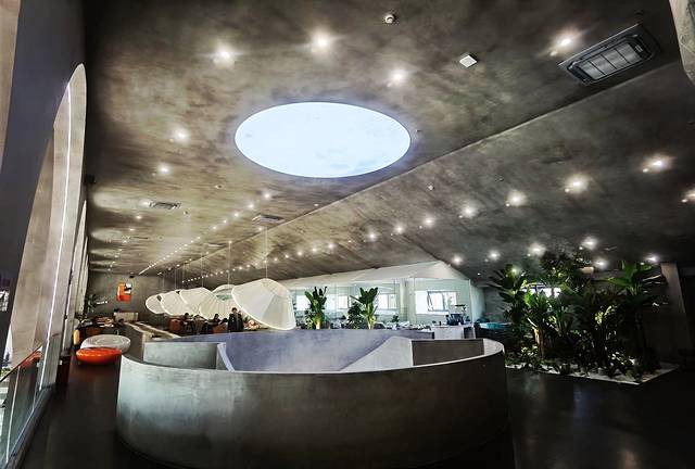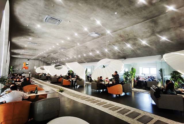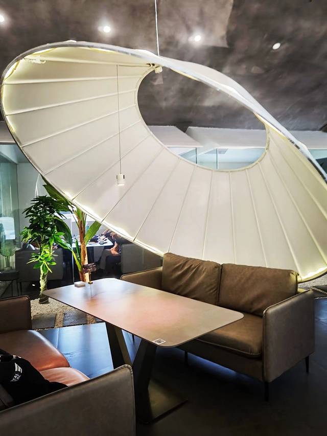 来到一楼,仿佛到了一个热带丛林,一簇簇、一丛丛的绿植+灰、白主色调和明亮的橙色沙发,色彩反差明显,对比强烈,有着一种热烈奔放的背景,一下子提升了食欲;来到二楼,犹如到了一个海边沙滩,一排白色的大灯罩+两条蜿蜒的小石道,耳畔传来的海浪声,有着一种浪漫的情调,让人迫不及待地想大快朵颐;二楼还有个很巧妙的设计,除了三排卡座外,有几个像太空舱一样的全透明隔音小房间,很是新颖别致;餐厅里最火的一个地方,是连接一楼与二楼的螺旋形楼梯,这里是摆Pose、出大片的圣地,怪不得有人会说:建筑是凝固的旅行。