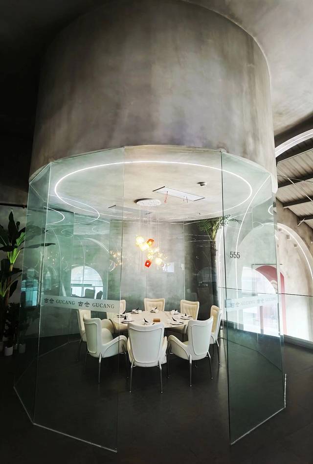古仓餐厅,位于“云间粮仓”内东29号,是一家新晋的网红打卡地,这里原来是一栋仓库,两层楼的建筑立面是灰色的,一点都不耀眼,唯有一个个落地拱型窗户里透出的灯光,隐隐约约地给这栋建筑带来一种神秘的色彩,大门没有那种富丽堂皇的装设,就是简简单单的一个拱形门洞,走进大门,全开放的纵深空间让人豁然开朗,进去体验后,发现有两大惊喜。