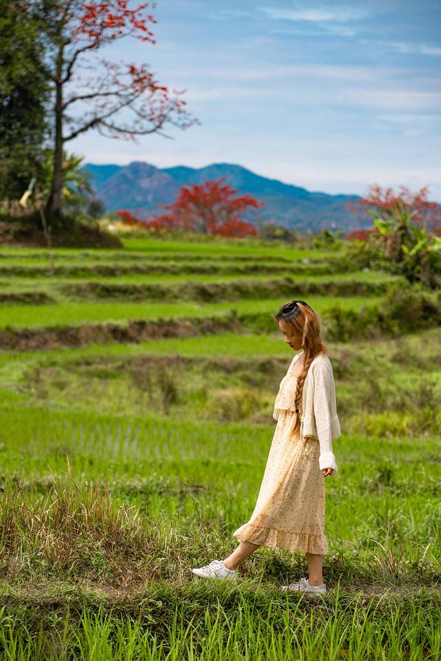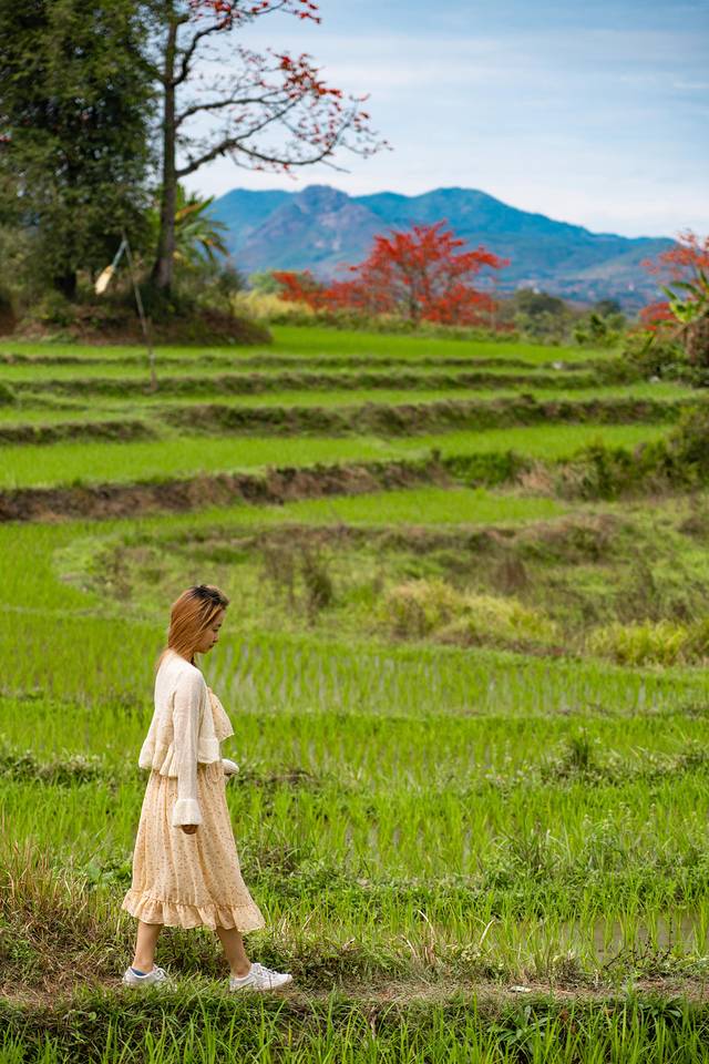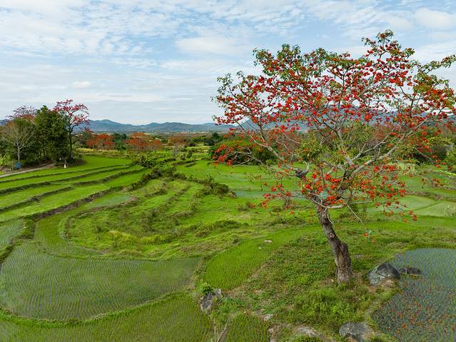 路过霸王岭景区附近时,被路边的一片绿油油的梯田所吸引,大片的草绿色水稻梯田配上鲜艳的红色木棉花点缀,组成了这幅独具立体感的画面,光肉眼看上去颜色饱和度就很高,就像自带滤镜一样。
