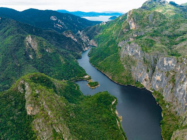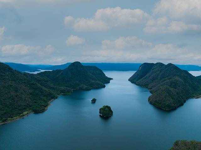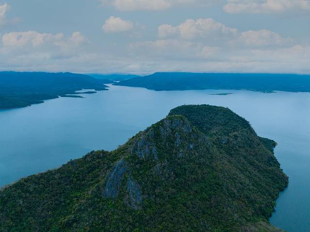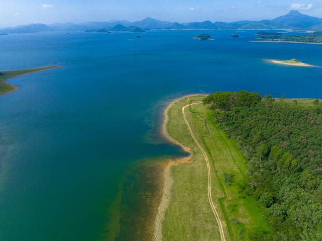 松涛水库是全国十大水库之一,也是海南省最大的水库,水库面积占据了儋州、白沙和琼中三块区域。在阳光的反射下,水面颜色呈现深海般的高饱和度的渐变蓝色,一点也不输海边。