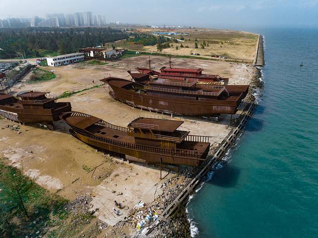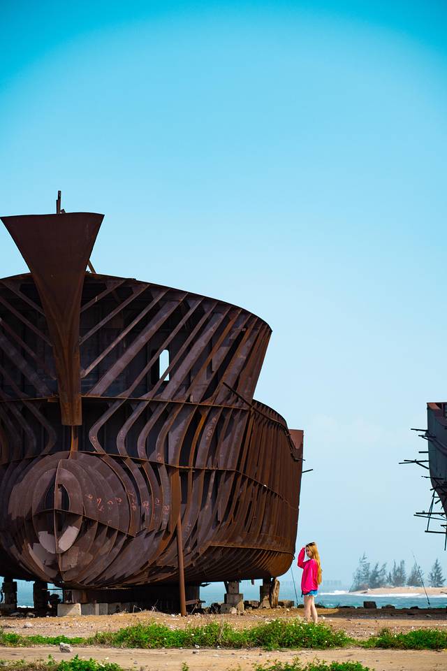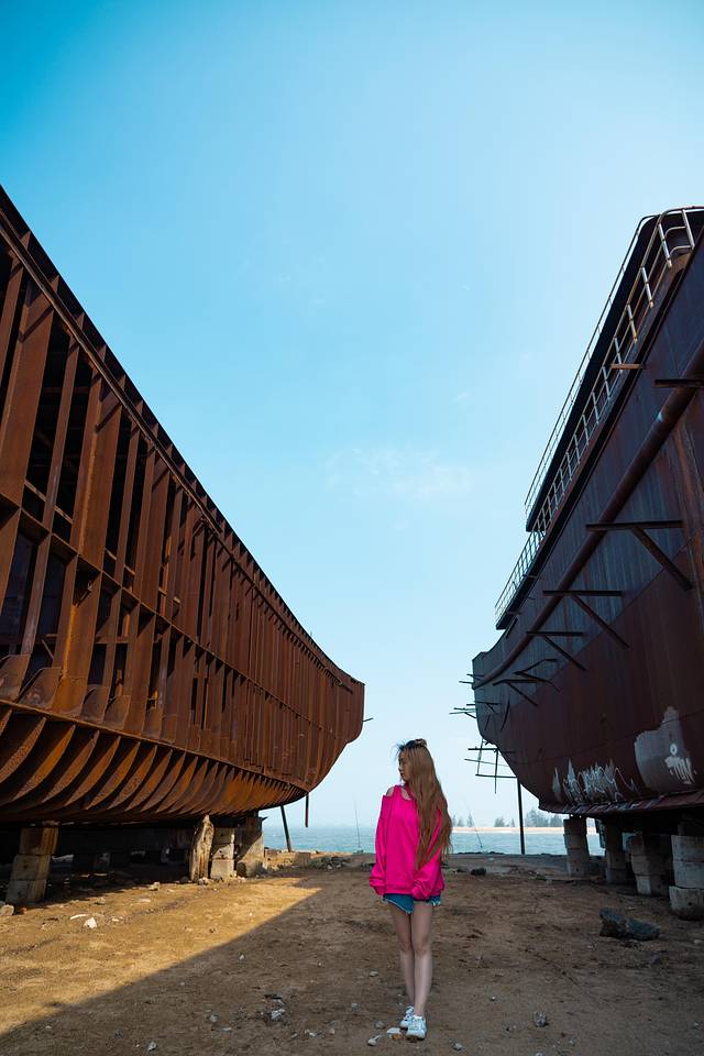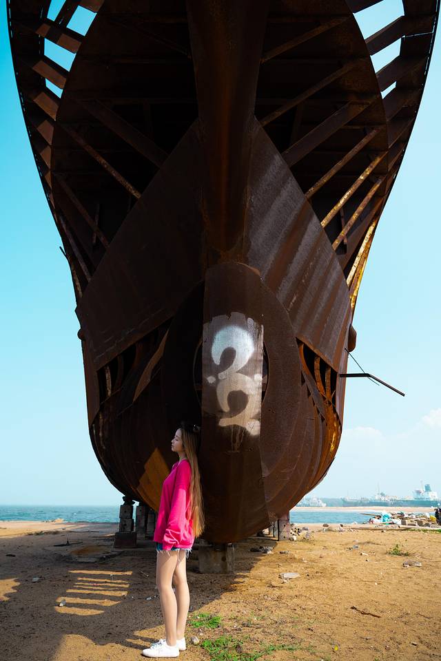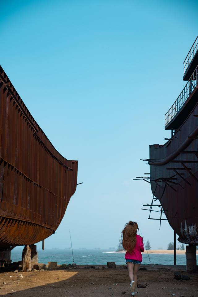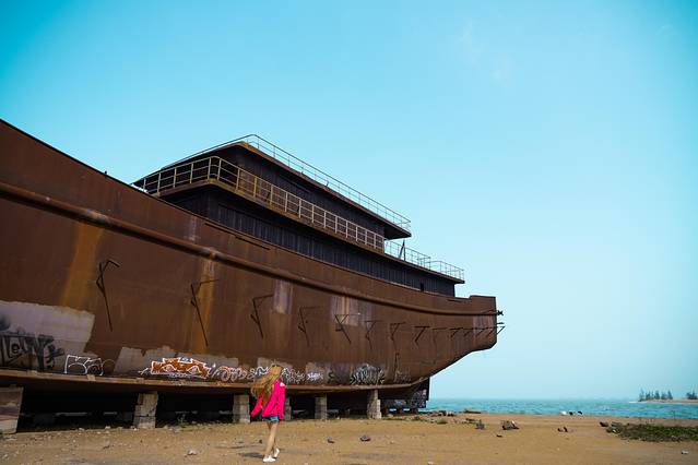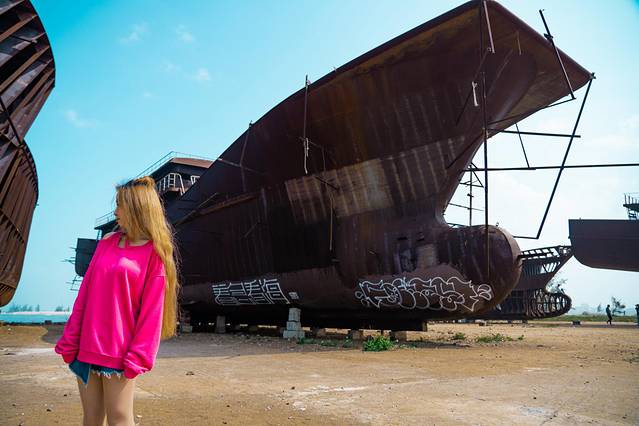 最后一站,距离海口机场也不远,同样位于海甸岛上,是一个靠着海边的废弃旧船厂,空地上都是一些废弃的大型船只,走近看特别高大壮观,蔚蓝的天空和海水映衬着生锈的铁皮,对比度很强,拍照特别出片。
