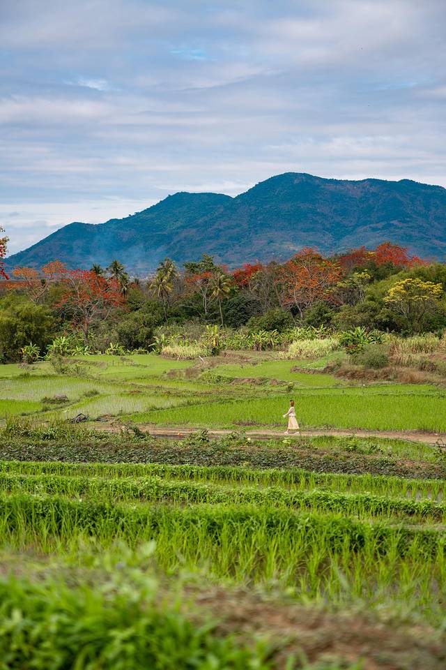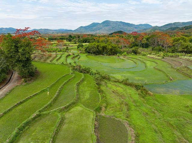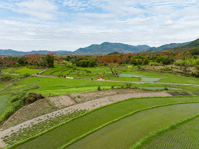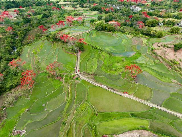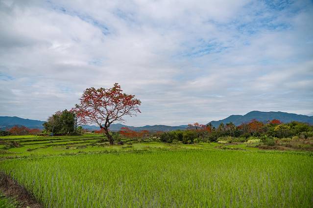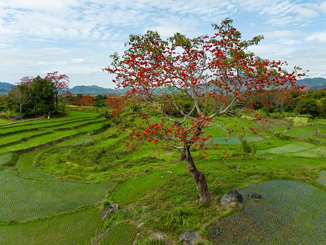现在正是木棉花开季节,水稻也刚刚种下,等到了秋季,就是一片金黄色的收割景象了吧。