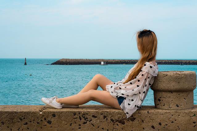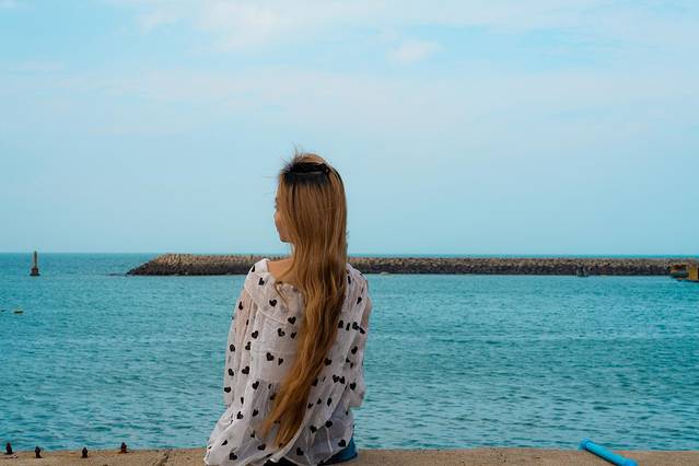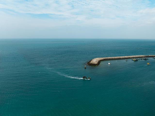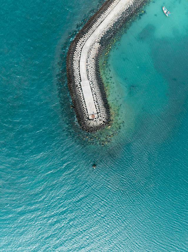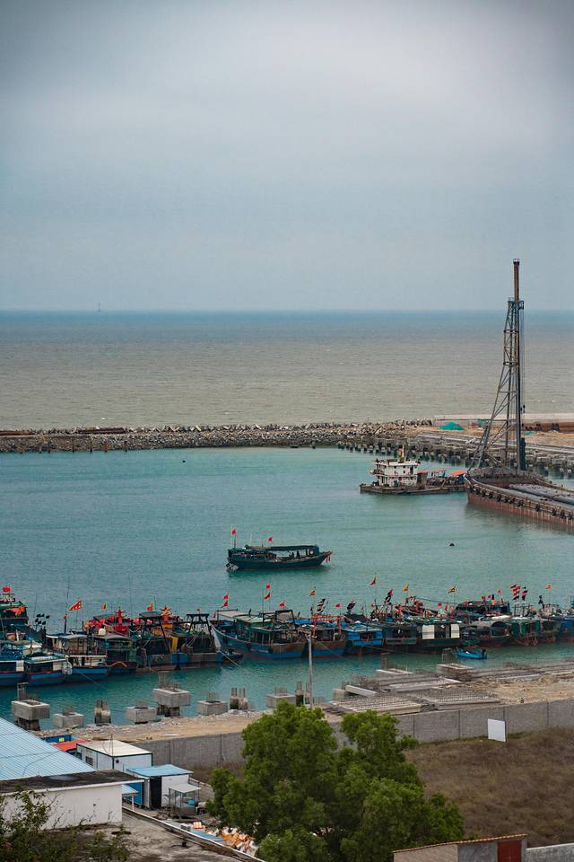 放大地图寻找,在距离 “ 临高角风景区” 目的地西面直线6公里的地方,我们找到了一条沿着海边的公路,这里有两座船只停泊的避风港,因为靠近码头,所以水位较浅,在阳光的照射下海水呈现出浅蓝色。