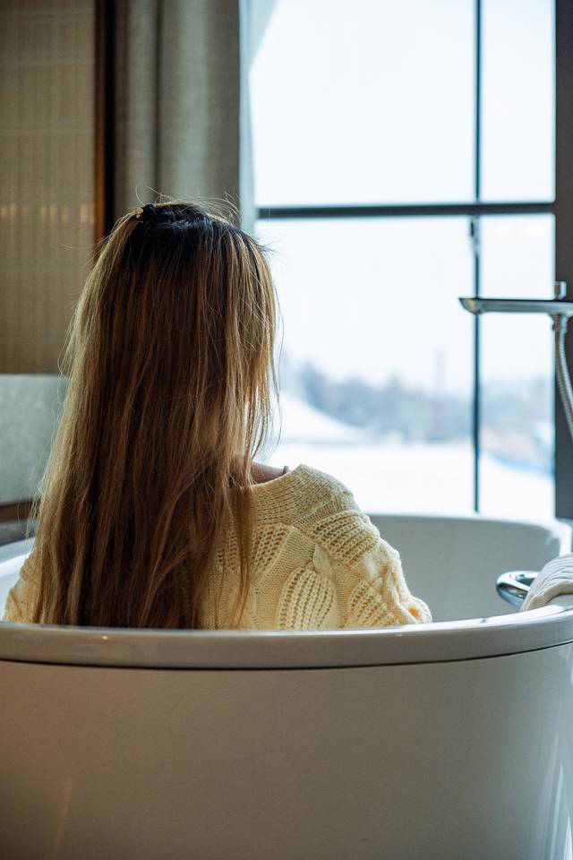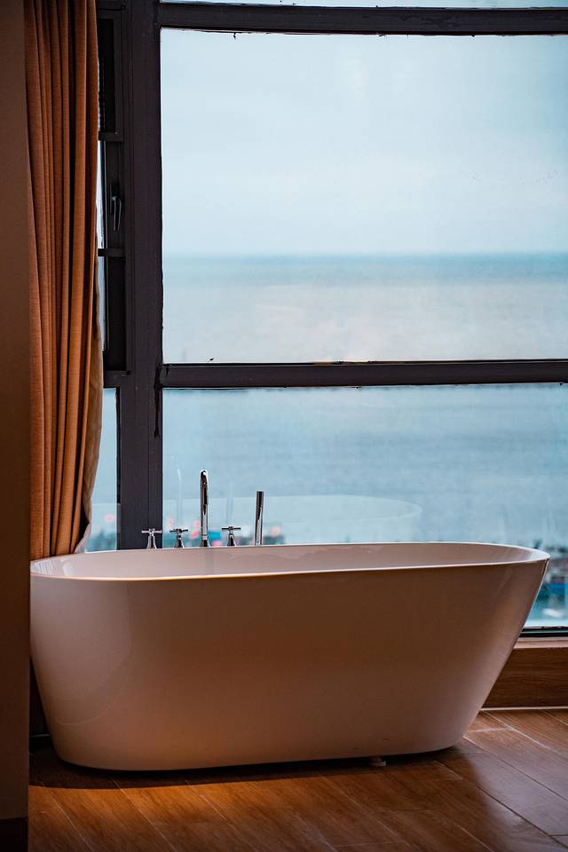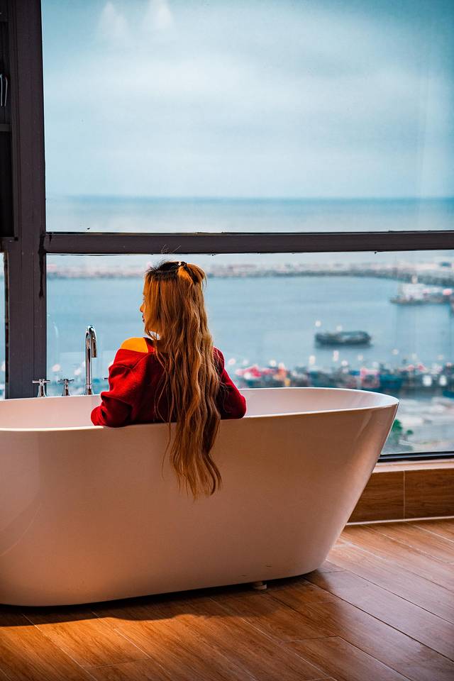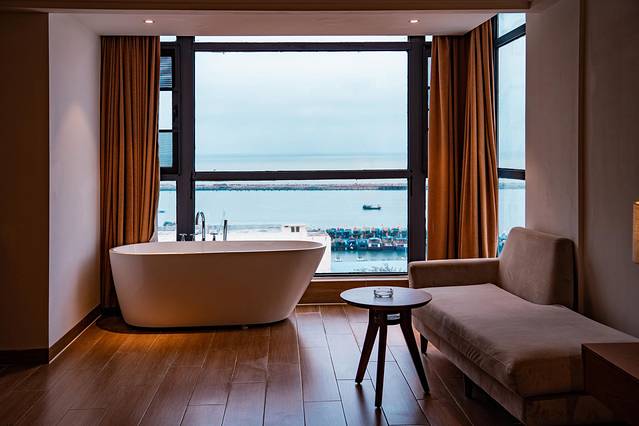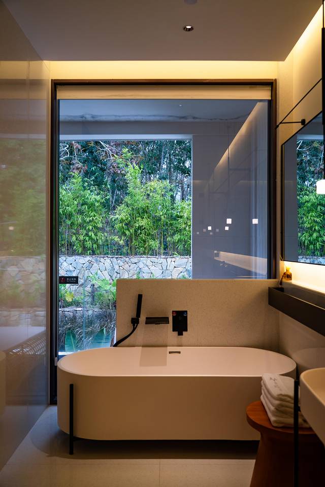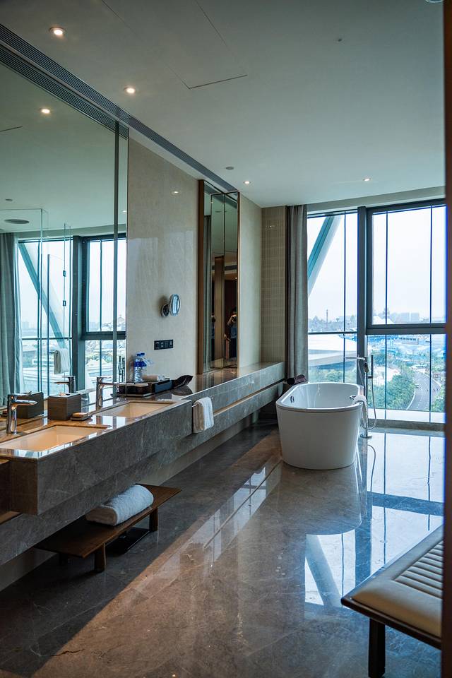 房间有48平,洗手间和卧室面积差不多大,显得洗手间很宽敞,落地窗的浴缸很好拍。