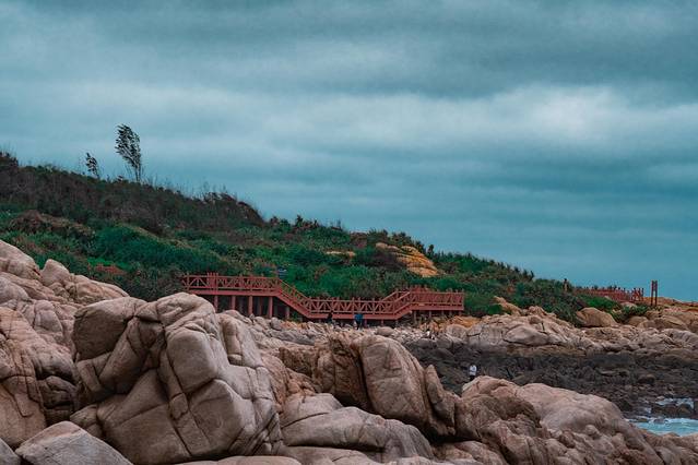 海边是被浪花常年累月拍打出的自然岩石景观,往深处走还有一个景观木栈道。