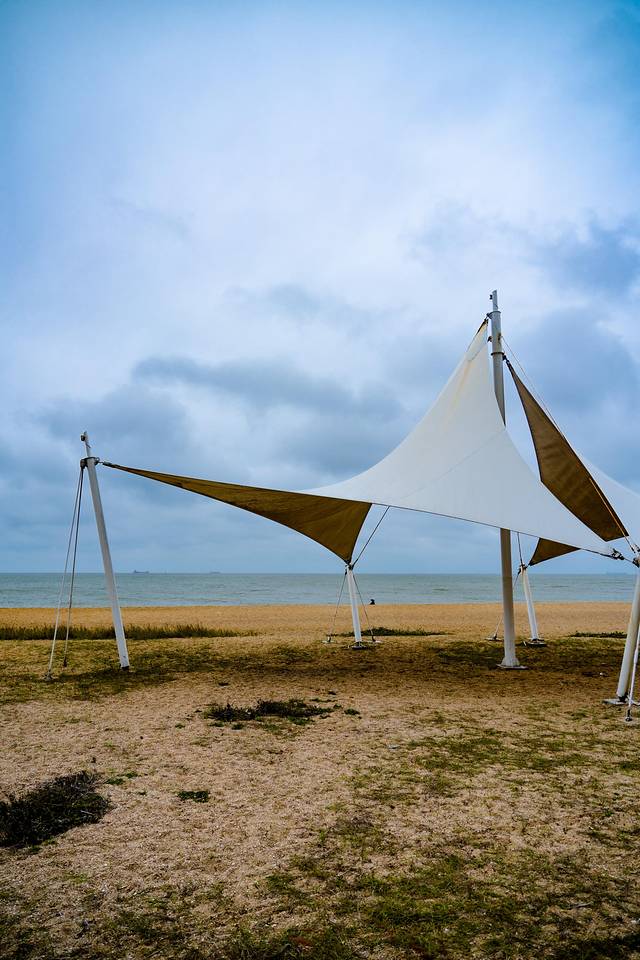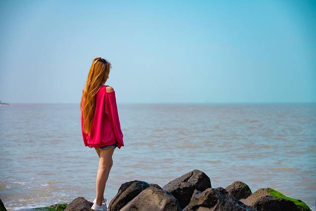 把镜头放低一些,可以把桥洞、海滩和天空同时拍进画面,很有层次感。