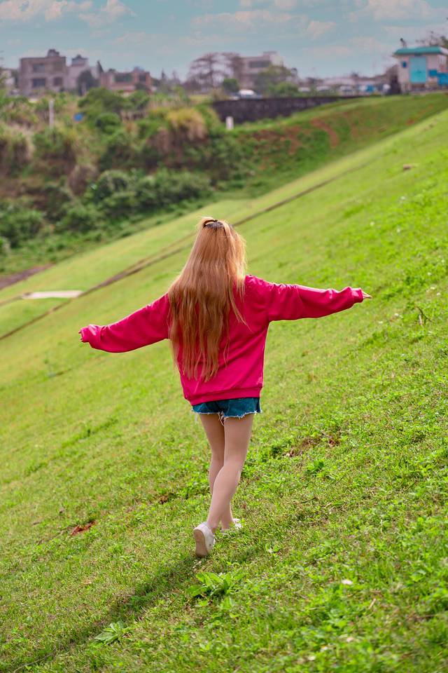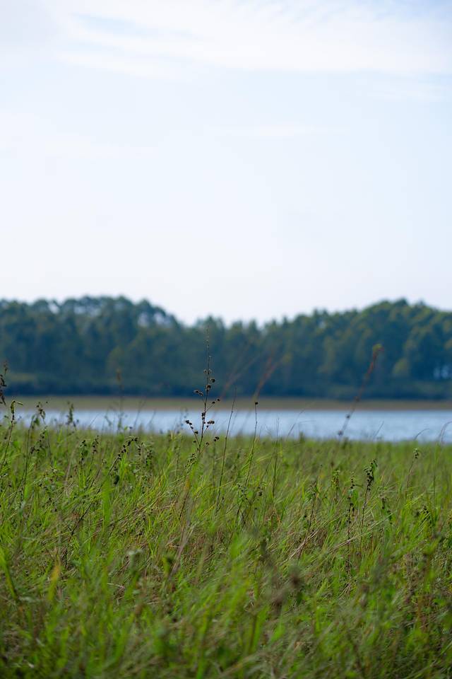 水边的野草坪在阳光照射下也很好看,可以站在草丛里拍。