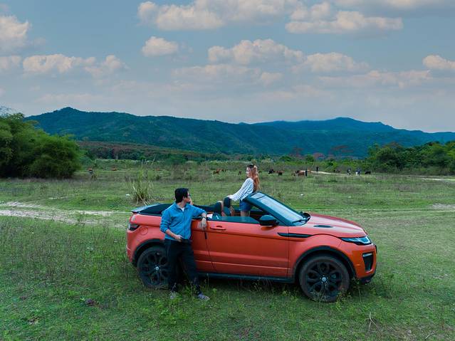 去年预订的牧马人,总费用4085含保险,平均下来600+一天。今年问了当时租牧马人给我们的老板,春节期间的价格涨到1500+一天,翻了3倍,实在是有点超预算,于是选择了我们一直以来也很喜欢的路虎极光进口敞篷版。总费用8713含保险,虽然也挺贵的,不过还是比牧马人优惠一些,而且橙色很夺目,suv版的敞篷也不多见,一路上回头率也非常高。在西线这样的山路泥路,跑起来轻松无压力。