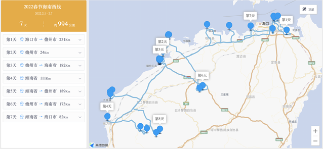 海口 —— 澄迈 —— 儋州 ——东方—— 昌江 —— 儋州 —— 临高 —— 澄迈 —— 海口