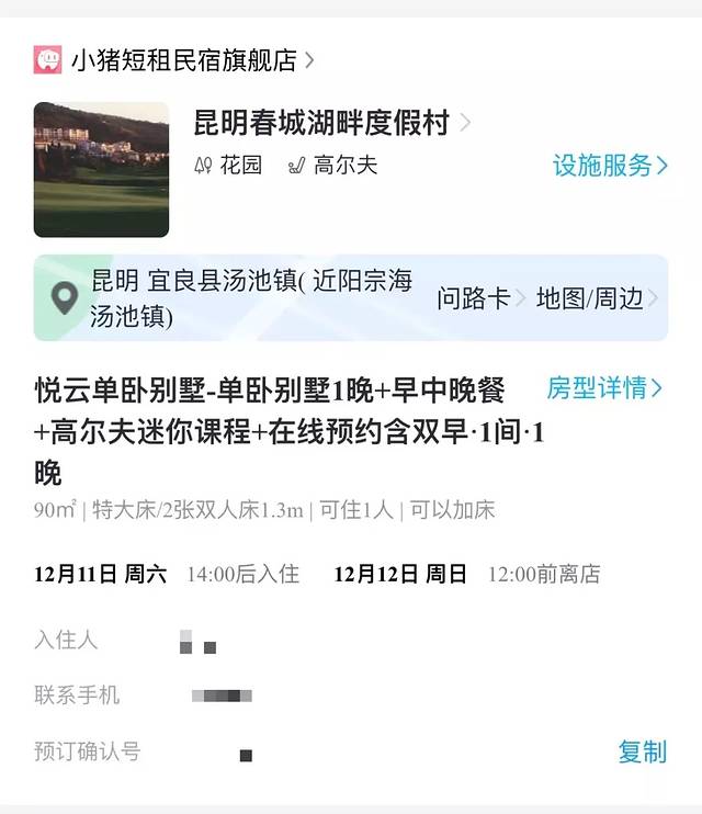 昆明春城湖畔高尔夫度假村是双十一种的草,在小猪民宿茫茫大海般的货表里第二眼选中的房券产品。当时的房券套餐到手价1299元,含单卧别墅1晚+双人一日三餐及夜宵+高尔夫迷你课程+十余项活动体验+机场及市区接送班车,周末及节假日可用不加价。