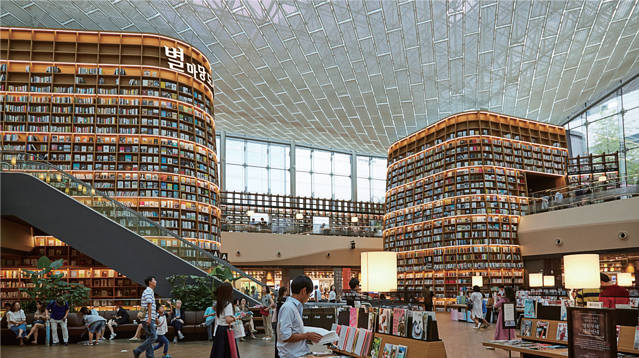 STARFIELD COEXMALL的亮点是位于购物中心中央的星院图书馆。填满整个购物中心广场的高耸云天的书架以及里面整齐排放的书籍打造出既雄伟又漂亮的风景。这里陈列的书籍共有大约5万本。其中也有很多外语杂志。即使不看书也可以坐着休息,或者在高至屋顶的巨大书架前拍照留念也不错。图书馆中间设有舞台,还会举办小型音乐会。