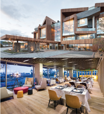 由世界著名建筑师“伊丹润(Itami Jun)”设计的酒店。从天空俯瞰整个酒店就如同葡萄串一样,所以酒店取名为“葡萄酒店”。让人联想起济州岛草房的圆形屋顶建筑与济州岛广阔的原野并列在一块,彷佛就像大自然的一部分,使人倍感舒适。“葡萄酒店”不但以其独特的建筑美而闻名,而且以新鲜、健康的西餐厅而有名。用天然生鱼片和新鲜的山间食材做成的济州传统饮食以及多种多样的独创混合料理,一直深受宾客的好评。红酒吧内还出售世界各国的80余种红酒,这里的红酒都是在最佳的温度下保存的。这里有粥、金枪鱼调料生鱼片、东坡肉、干蒸肉、烤黄油鲍鱼、辣炖带鱼等丰盛的晚餐,厨师精心制作的餐后甜点“葡萄套餐”,以及份量十足的“炸大虾乌冬面[왕새우 튀김우동]”等,这些都是来葡萄酒店时一定要品尝的代表美食。