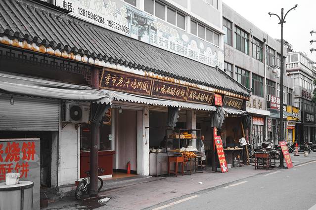 在古镇里,如果你请当地人推荐本地特色小吃,他们随口就能说出很多种,像斩肉、皮卷、老汁鸡、夏水、头菜、肝大肠等等。只要去季市的老街走一走,你会发现这里的大酒楼、饭店比较罕见,小吃铺倒是很多,但寻来觅去,看到最多的还是烧饼。一条长长的的老街,是一场饼、糕、面的大party。