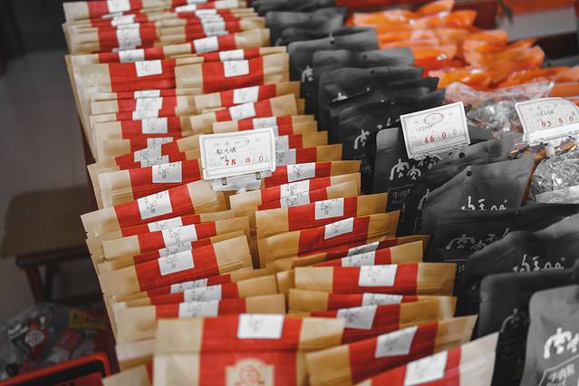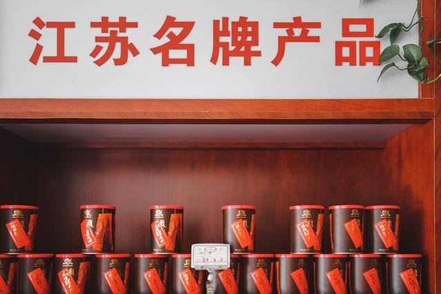 与其他地方肉脯用肉糜制作不同,靖江的双鱼肉脯是精选优质猪后腿腿心部分的鲜肉片辅以几十种优质香料制成,拿在手里还能看得见肉丝。