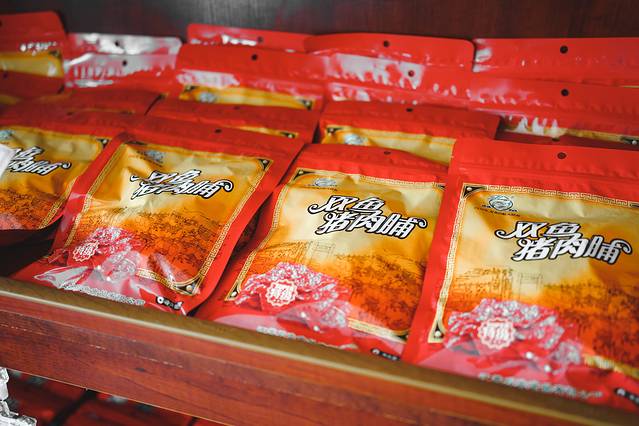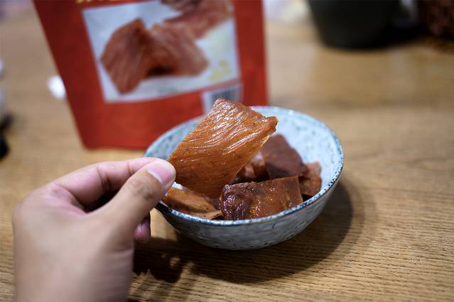 和澳门肉脯不太一样,双鱼猪肉脯口感更硬一些,很有嚼劲。