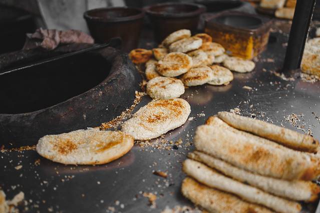 大炉饼是这条街上最红火的小吃,饼外有满满一层芝麻,焦香的酥皮包裹着软糯的豆沙。