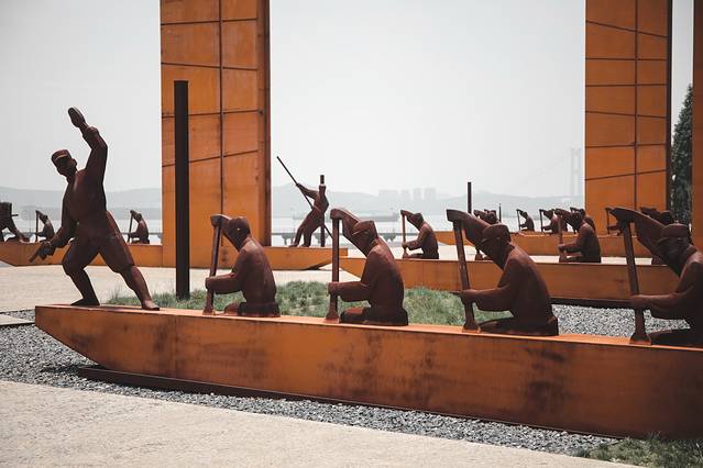 昔日英雄们战斗的地方,现今这个地方精心打造了“东线第一帆”纪念公园,公园依长江岸线,利用原来的湿地而建,江边矗立着一组百万雄师横渡长江的雕塑,让人仿佛看见了弥漫着当年的硝烟,听见了那轰隆隆的炮声。