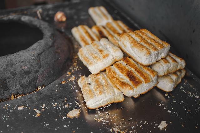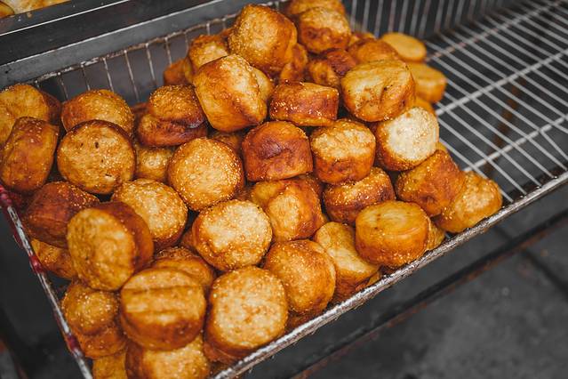 涨烧饼是当地人中秋佳节祭祀的主要贡品,象征着一家团团圆圆,玉兰涨烧饼店家的几十口铁锅占了半条街,油汪汪的锅,每口都烧的漆黑发亮,把发酵好的酒酿面饼往锅里一放,再浇上滚烫的热油,靠油水慢烧,大约一小时后饼才能熟。