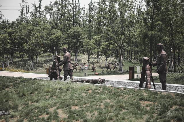 战前练兵雕塑群分布在湿地和芦苇荡中,通过艺术手法再现解放军战士战前练兵的场景,如水中练兵、自制芦苇救生圈、解放军炮兵阵地等历史场景。