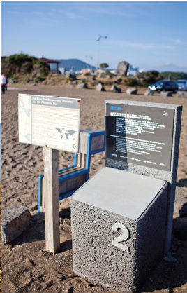 “广峙其海边”是欣赏济州日出美景的知名场所。在城山日出峰的形成过程中,火山碎屑被风吹起又落下,层层堆积起来才形成了今天的广峙其海滩。广峙其海边最初与城山日出峰并不相连,是风力作用下形成的小坡最终将两者连接在一起。广峙其海边也是济州旅游景点之一,知名度毫不逊于城山日出峰。除了欣赏日出美景,广峙其海边还是情侣、家人喜爱的漫步场所。当然,游客还可以体验在海边骑马的浪漫。