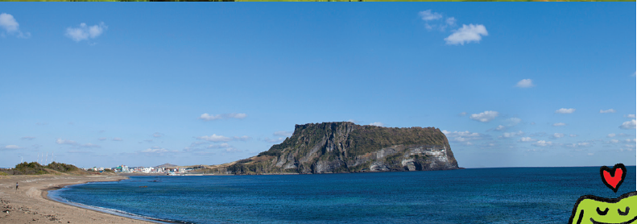 年前火山爆发而形成的岛屿。关于飞扬岛流传着这样一个有趣的传说:曾经漂泊于中国的一座小岛在潮流的推动下来到了济州岛,见此情景的海女指着小岛喊道“漂来了一座小岛!”,话音刚落,受到惊吓的小岛便在原地停了下来,于是便成为了“飞扬岛”。虽然岛上每天只有3次渡轮航班,但是由于岛很小,慢慢步行的话也只需要两个小时就能游览完一遍,所以在下一班渡轮到达之前就可以将飞扬岛游览完毕。到达港口后先在附近的餐厅里吃一碗用济州海螺“黑钟螺”制作的传统饮食“黑钟螺粥”,填饱肚子后再开始飞扬岛旅行吧。附近的民宿出租自行车,骑着自行车在飞扬岛上游览也是不错的选择。如果想通过步行来感受飞扬岛的话,就到飞扬岛中央高高耸立的“飞扬峰”上去看看吧。这里是以风光秀丽而有名的景点,天气晴朗的时候还可以眺望到远处的汉拿山。