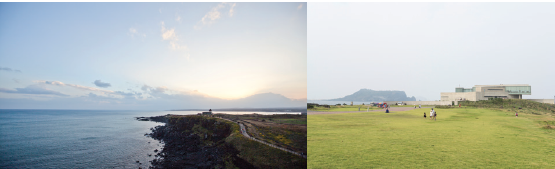 在涉地可支碧绿的草原上,有一座名为“Genius Loci”的建筑。“Genius Loci”有“大地灵魂”之意,是世界级建筑家“安藤忠雄(Ando Tadao)”设计建造的作品。外露混凝土与济州岛传统石墙相互协调的建筑外观和济州岛碧绿的草原相交辉映,更增加了美感。走进建筑内部,首先映入眼帘的是以济州岛3多“石头多,风多,女人多”为主题建造的庭院。在花朵盛开的庭院之间建有一条专门用来通风的道路,在这可以感受从石墙之间吹来的凉风。沿着水泥石墙可以到达名为“View Finder”的石墙,从这可以眺望水流飞溅的“壁泉”和城山日出峰。建筑设计时还考虑到了自然采光的角度,所以阳光下的建筑显得格外美丽。建筑内设立的冥想空间也是这里的特色。室内只有自然光和隐隐约约的照明,并播放着柔和的多媒体艺术影像,用平静的心感受一下冥想带来的乐趣吧。