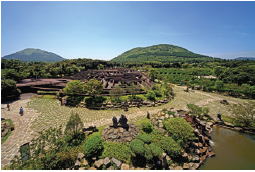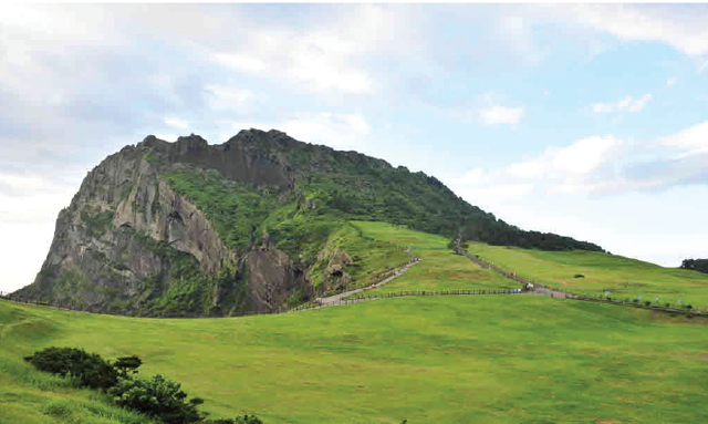 “城山日出峰”位于济州岛东海岸,是一座形成于12万年至5万年前的“水火山”。所谓水火山是指岩浆从水深较浅的海底喷发而出,遇海水后爆发而冲出海面的火山灰落下后逐渐积累并最终形成的山丘。不过,大部分海底火山爆发形成的“水火山”都隐藏在海水下,像城山日出峰这样整个火山口都显露在海面之上的情况极其少见。城山日出峰高182米,火山口深90米、直径为600米,地表倾斜度最高可达45度。由这些地形特征可知,城山日出峰是典型的凝灰锥,即火山岩屑或火山渣堆积形成的山丘。虽然在全球范围内有不少火山凝灰锥,但却没有像城山日出峰一样具有火山凝灰锥的鲜明特征,而且内部构造丰富多样。基于城山日出峰突出的学术研究价值与其优美的自然景色,联合国教科文组织于2007年将其列入了世界自然遗产名录。城山日出峰形成之初是一座与陆地分隔的“孤岛”,后来随着新阳海水浴场的沙子与鹅卵石逐渐堆积,最终才与陆地连接起来。城山日出峰是大自然最神奇的艺术作品,让所有人看过便会念念不忘。