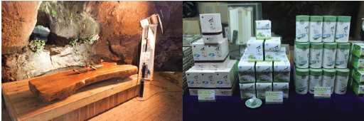 复合型主题公园“茶喜然”里面有一座天然洞窟咖啡馆,据说是利用种植有机农绿茶园时偶然发现的洞窟而建造的。因为是洞窟,所以很容易想成是窒闷阴暗的地方,但是宽敞的空间和雅致的照明使这里非常气派。菜单包括用亲自栽培的绿茶制作的绿茶拿铁、绿茶冰激凌、放入绿茶粉制作的绿茶年糕和甜饼等。咖啡馆内不仅有饮食,还有许多可以当做纪念品带走的商品。“茶喜然”里用绿茶制作的袋泡茶组合、绿茶发酵液、绿茶巧克力以及可以在家喝的独立包装的绿茶拿铁粉等都比较适合用来送礼,深受游客喜爱。