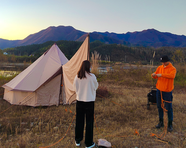 我们此行意在追求无拘无束的慢生活,所以我们没有在镇上多停留,而是驱车入山,在一处平坦的滩涂停了下来,这里背靠大山,面前是一片滩涂地,延伸到远处是一条河。