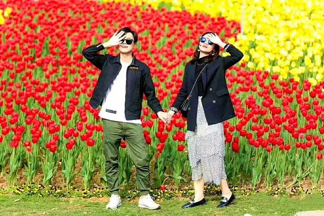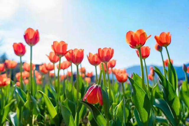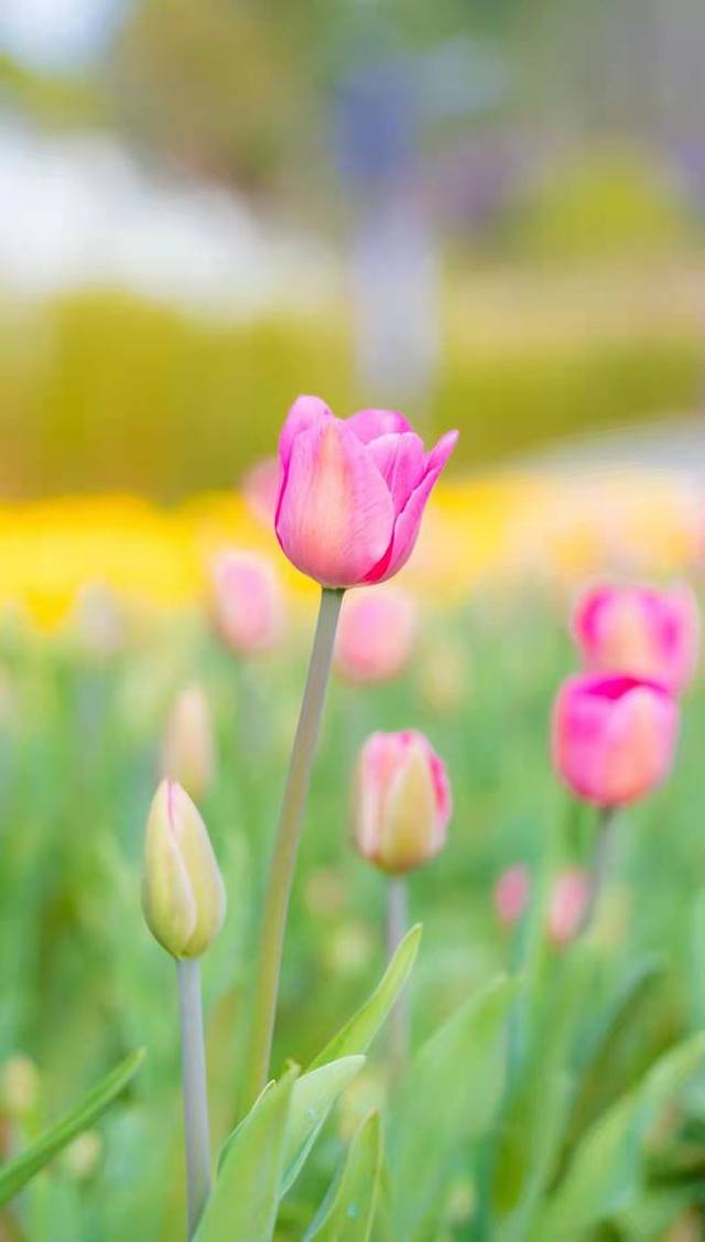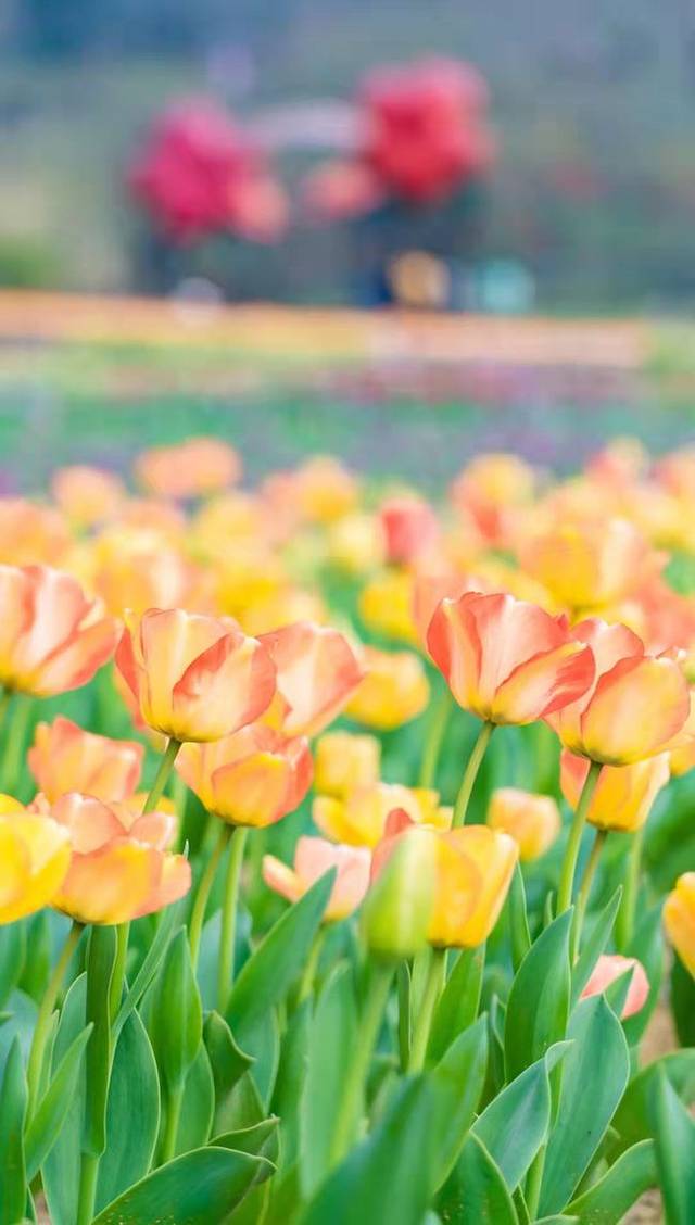 虽然现在的气温刚刚回暖,还不是那么舒适,但花海内的郁金香却个个都是“急性子”,火急火燎地早已冒出了花苞,开了一茬又一茬。