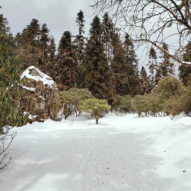 路上积雪覆盖,带小朋友玩雪的可以选择合适的地方停下来玩耍。堆雪人,打雪仗,坐滑雪板,拍照都可以玩的很开心。我们此行目的地为龙池湖,大概距山门8公里。一路拍照玩雪,大概走了三个半小时,12点左右达到杜鹃园。杜鹃园从大路的旁边有条铁丝围栏挡着的小路过去,能看到一块巨石。4、5月份高山杜鹃盛开时,肯定会很惊艳,适合拍照。