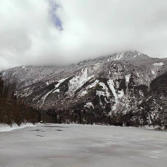 一处冰封的湖,被白雪皑皑的群山包围。山顶云雾缭绕,群山安静严肃,静谧至极。环湖有旅游栈道,顺着右手边走了五分钟,听当初从此山里搬出的当地人说右边道有条沟,沟水干净回甜,她们每次上来必手捧解渴。夏天能开车上来时,甚至会提桶运水回去煮饭烧水喝。