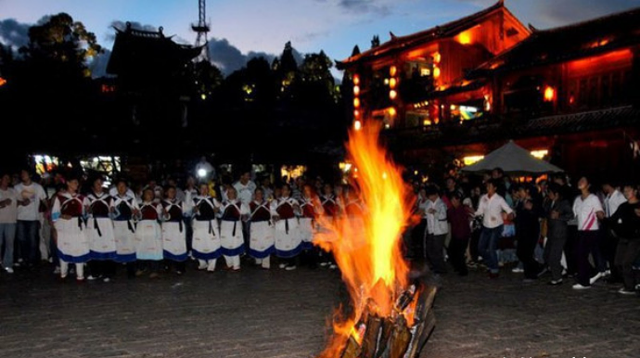 四方街:丽江古城最中央的一片大约500平方米的小广场,街面宽广,主街有四条,向四周辐射,均由五彩花石铺就,原本是各族人民在此交易商品的地方,现在已成为游客聚集的地方。每周二,四,六三个晚上,当地青年会自发聚集到四方街打跳。打跳是云南很多地方的人都喜欢的一种民间集体歌舞活动。