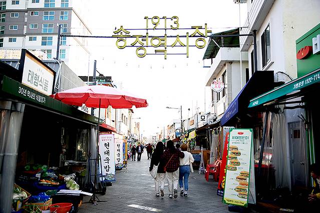 韩国全国之内如此”IN”的市场应该仅此一家啦。位于光州松汀站前的1913松汀站市场(1913 송정역시장)绝不是传统认知中的市场。这里不仅出售一般传统市场都有售的小吃,还有很多特色美食——法棍汉堡包、鸡蛋饭、红参酸奶等。特别是市场内出售的火竹签(불꼬챙이)是男女老少都喜爱的一道人气小吃。此外,出售使用全罗南道方言而制成的月历及笔记本的精品店——“旸胥事笑”也是1913松汀站市场内的网红打卡处。