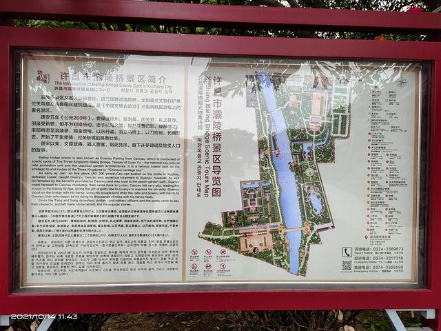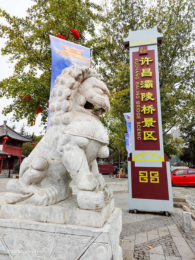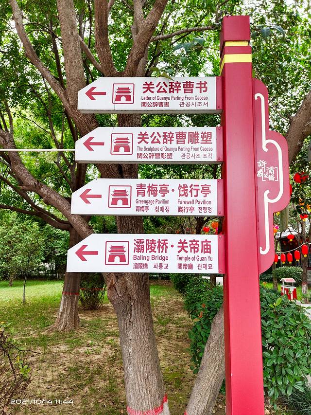 灞陵桥景区,位于河南省许昌市建安区“许继大道”西段7号。“灞陵桥”原名“八里桥”,位于许昌市城西约4公里的石梁河上,相传为三国蜀汉名将关羽离别许州(今许昌)时辞别汉丞相曹操处。东汉建安五年(公元200年)下邳之战,曹操俘获关羽及刘备妻妾甘,糜二位夫人归许。加官进爵,"礼之甚厚",然而,关羽不忘旧主,执意寻归刘备,遂挂印封金,保护二位"皇嫂"车仗,斩关西去, 行至灞陵桥时,曹操率群僚赶来为关羽赠袍饯行,关羽疑其有诈,立马桥头,以刀挑袍,辞曹西行,开始了震惊世人的过五关,斩六将,千里走单骑的壮举.灞陵桥即为"汉关帝挑袍处"。后人推崇关羽"忠,义,仁,勇"的品格,遂在桥西建关帝庙设像以祀。景区由灞陵桥、关帝庙两大部分组成,共有六个景点:门阙、照壁、青梅园、灞陵桥、关帝庙和桃园。关帝庙为清代建筑,其他均为仿汉建筑,整个景区是以集桥、亭、庙、园、林以及雕塑为一体的古典式园林。