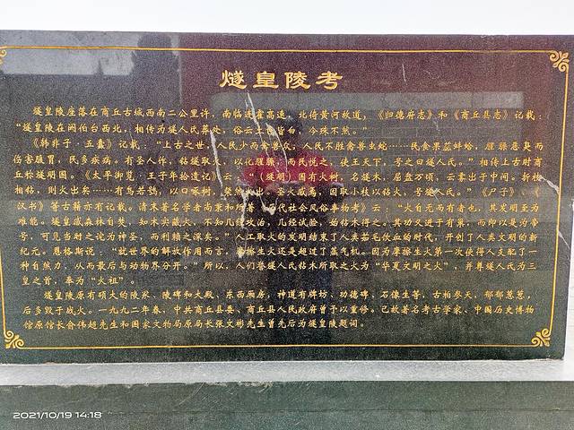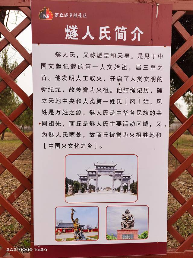 燧皇陵位于商丘市睢阳区华商大道与平原南路交汇处北200米处,占地面积约440亩。进入燧皇陵,首先看到的是一条神道,神道两边,有排列整齐的石雕,庄严肃穆,燧人氏墓冢和雕像矗立于陵区的中心,四周翠柏环抱,绿草如茵。燧皇陵为第十届全国运动会“华夏文明之火”圣火火种的采集地。燧人氏在三皇五帝中位居三皇之首,其“钻木取火,以化腥臊”,从而开创了人类走向文明的新纪元。