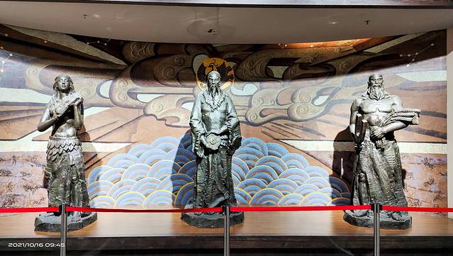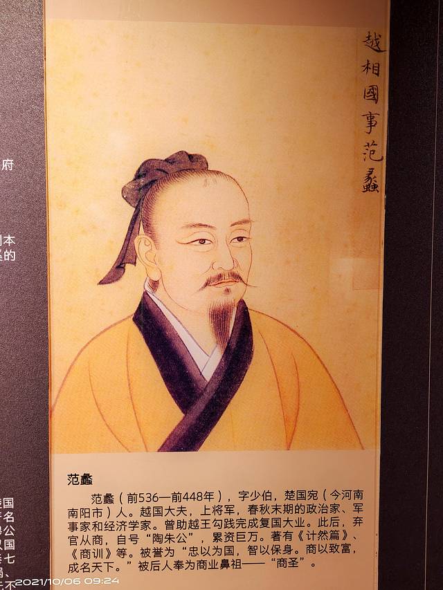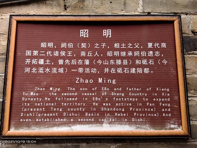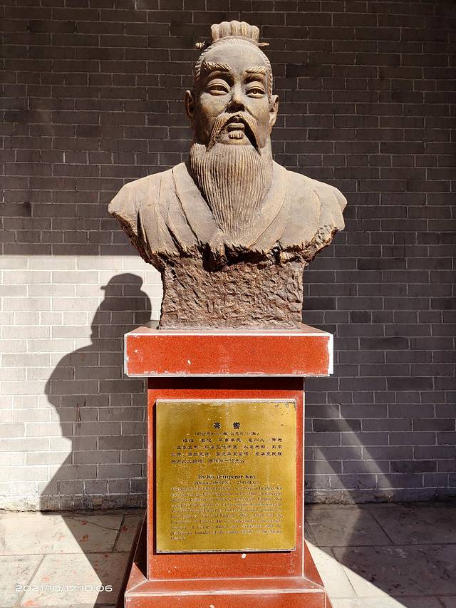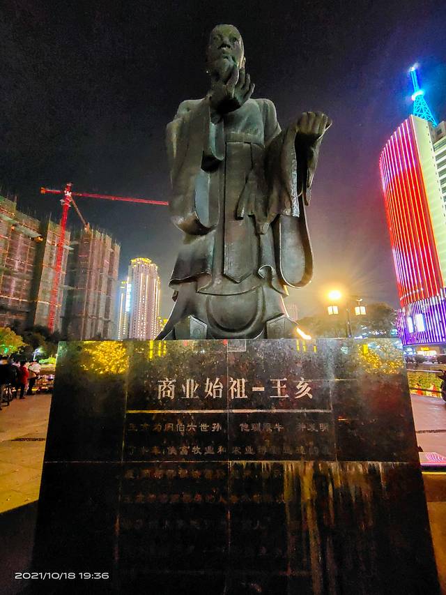 商祖祠王亥塑像。王亥是中华商业始祖,也是夏代中期诸侯国商国的国君、商部落的首领,不是一般意义上的商人,他带领商部落人到其他部落以物易物,除了一般意义上的物质交换,以满足生活、生产需要等经商行为之外,还具有增强国力、开拓疆域等政治目的。王亥的这一身份和地位及其活动性质和目的决定了他是一个“亦王亦商”的人。这尊塑像既表现了王者气概、大家风范,又表现了商人的睿智精明,人物造型动感逼真,面部表情慈祥亲和,准确反映了中原人特有的气质、体质特征。