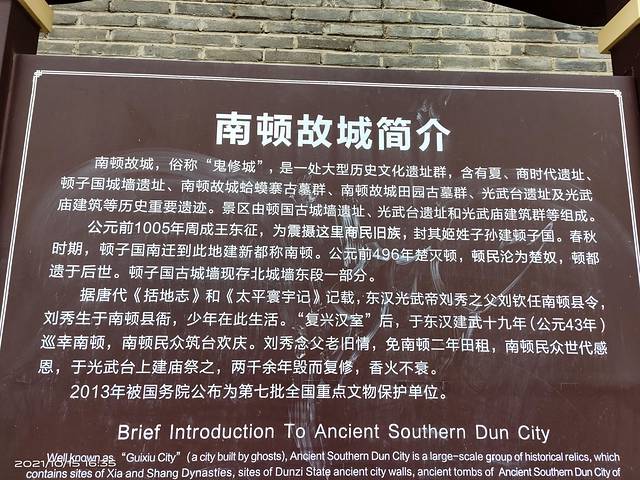 南顿故城又名“鬼修城”,位于河南省项城市西郊,隶属项城市南顿镇政府,是一处大型的历史文物群。含有南顿夏商时代遗址、南顿故城遗址、南顿故城现存城墙、南顿故城古墓群、光武台遗址、光武庙等建筑历史遗迹和文物。2013年5月,被国务院核定公布为第七批全国重点文物保护单位。公元前1005年,周建王建顿子国;公元前637年,五霸争雄,顿子国将国都南徙,迁至颍水南岸(今南顿),故史称南顿。南顿故城,俗称“鬼修城”,相传王莽赶刘秀时,刘秀令小鬼一夜所筑,于是,流传诸多脍炙人口的历史典故。