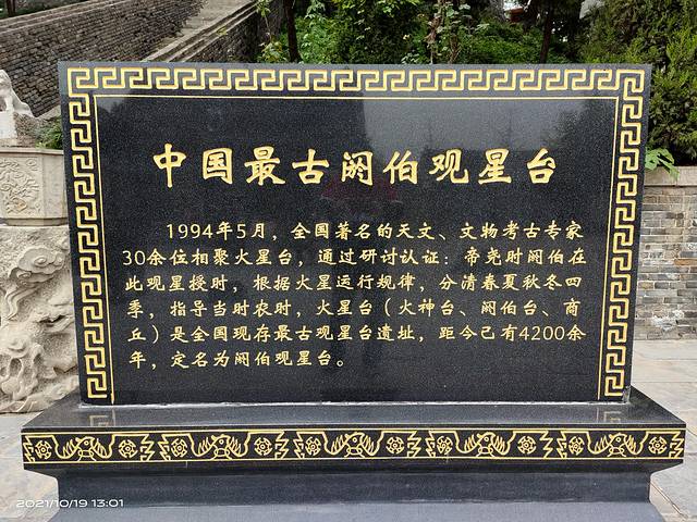 华商文化遗产主题公园商祖祠的后面,就是阏伯台,古称商丘,民间称火星台、火神台,是距今4500多年的一处观星台遗址,它比东汉天文学家张衡在洛阳建的灵台,还早上2200多年,是中国现存年代最早的观星台,对研究中国天文发展史是不可多得的实物资料,具有极高的科研价值。阏伯台是帝喾之子阏伯所建造的观星台,商族始祖阏伯一生不辞劳苦造福于黎民百姓,人们非常敬仰他,把他喻为“火神”,所以此台又叫“火神台”。 阏伯死后,人们就按他的遗愿,将他葬于台下,因其封号为“商”,此台又被称为“商丘”。