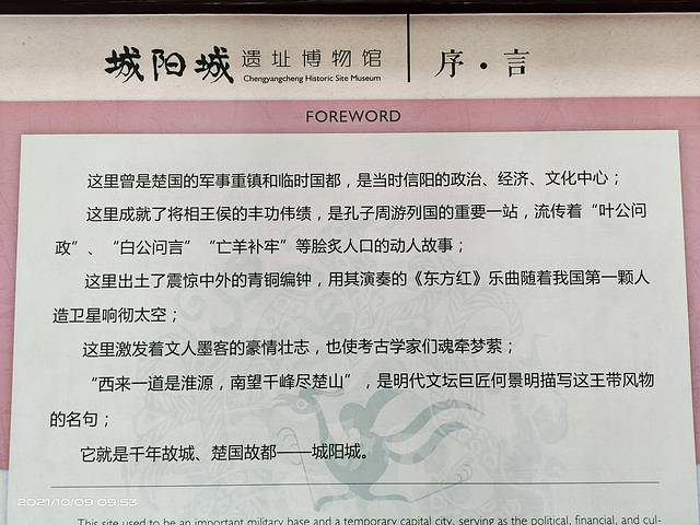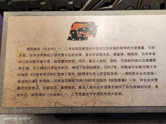 城阳城,又名楚王城,位于信阳市北25公里处,是国务院确定的国家重点文物保护单位,为国家现有6座楚国城址中面积最大、保存最好最具有考古价值的一座。城阳城为春秋早期所筑,时称城阳,是楚国北攻东进的军事重镇。公元前278年,秦破楚都,楚襄王曾到此避难,把城阳城作为楚国的临时国都。“亡羊补牢”的典故就出自此地。秦汉魏晋为城阳县、郡,隋唐以后逐渐废弃,前后1000多年。城阳城址包括内城、外城、太子城、楚墓群等。城阳城保存完整,分内外两城,内城周长5484米,面积68万平方米;外城也叫防御城,面积182万平方米。1957年发掘的1号墓震惊全国,出土了我国第一套完整的青铜编钟,用其演奏的"东方红"乐曲随着我国第一颗人造地球卫星回响太空。在这里发掘了最早的毛笔、最早的竹书、最早的床、最早的枕头、最早的铜胎漆器等。城阳城遗址博物馆是坐落于城阳城址国家考古遗址公园一角,为第四批国家三级博物馆。博物馆从经济、军事、艺术、信仰等多维度了解两千多年前楚国人的物质文明和精神世界。博物馆有馆藏文物400余件,涵盖青铜器、陶器、木漆器、玉器、墓葬展示、杂件等多个类别。我们参观了博物馆、一二号战国楚墓、编钟广场,由于天气不好,就没有去太子城了。在这里用时一个半小时。