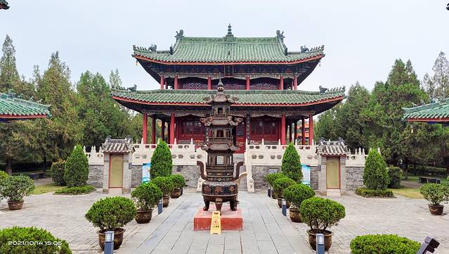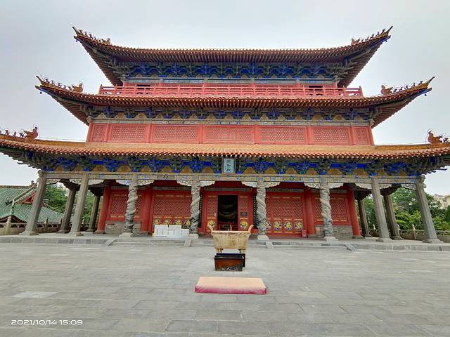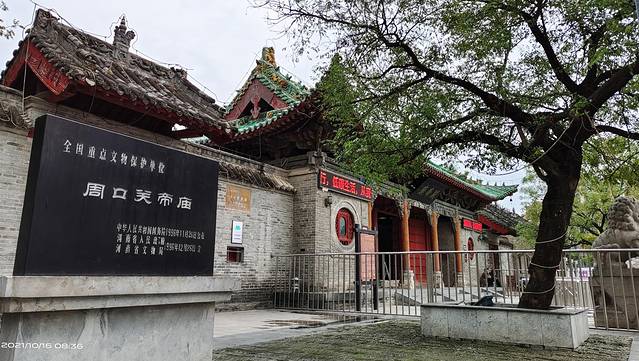 周口关帝庙,位于河南周口市川汇区中州路沙颍河北岸,,始建于康熙三十二年(1693年),乾隆、嘉庆时多次扩 修,至道光十六年(1832年)全部建成,前后历时145年,东西宽105米,南北长158米,面积达12590平方米,占地20余亩,是“豫平原保存较好,建筑艺术价值较高的古建筑群”,为全国重点文物保护单位,国家AAA级旅游景区,号称“周口八景之冠”。