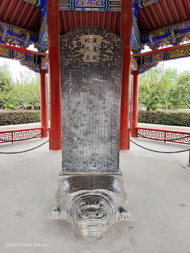 刘邦斩蛇处又称汉高祖斩蛇碑、斩蛇碑,是为纪念汉高祖刘邦斩蛇起义而建的,位于芒砀山。秦末,泗水亭长刘邦送徒骊山,途经芒砀山遇白蛇挡道,挥剑斩之,隐匿于芒砀山泽之间的“密云洞”,后响应陈胜起义自此起兵,反秦灭项成就帝业。汉高祖刘邦斩蛇碑是后人为纪念汉高祖刘邦 斩蛇起义而立的碑记,位于 芒砀山主峰南麓。始建于汉文帝时期,多次重建,现存为复制明朝石碑,碑高2.39米,碑额书“日月”和“汉高斩蛇之处”几个大字。碑座是一巨大的赑屃。夜间光照石碑显现 刘邦高大威武幻影,被誉为“天下奇观” 。