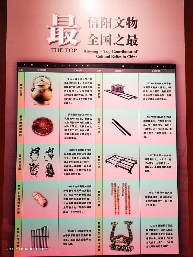 信阳博物馆。信阳有十个全国之最。其中,信阳出土的一件旷世珍宝,商代酒器夔纹提梁卣,其中尽然仍有一公斤左右3000多年前的商代古酒,这是迄今保存历史最长的古代陈酒,成为世界最古老的酒,并载入《世界吉尼斯纪录》,成为中国考古史上的又一重大发现。