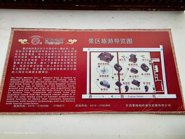 曹丞相府位于许昌市区魏武帝广场东侧,占地18亩,是中国第一个全方位展示曹魏文化的主题景区,也是许昌市重点旅游项目。整个景区由曹丞相府、魏武帝游园、周边旅游商业街区等部分构成。总投资2.3亿元人民币,总占地面积约30000平方米,总建筑面积约8000平方米。曹丞相府由府门、求贤堂、七步阁、议事堂等组成的汉代仿古建筑群,是许昌市三国文化景点的重要组成部分,将成为曹魏故都的标志性景观。 曹丞相府是曹操处理军国大事的地方,奠定曹魏霸业的屯田令和求贤令都在这里诞生。据史料记载,曹操于建安年间迎汉献帝于许昌,进位丞相,挟天子以令诸侯,加九锡,封魏王。后曹丕篡汉,曹氏府第由相府而王府,复又演变为皇宫。